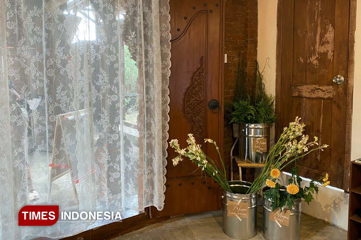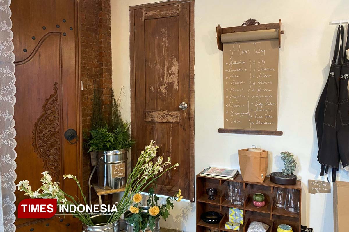 Interior hangat Tangkai dengan pintu kayu ukir dan tirai renda menghadirkan suasana seperti ruang tamu. Konsep ini membuat pengunjung merasa bertamu, bukan sekadar membeli bunga. (Foto: Firyanka Mirna Wahita/TIMES Indonesia)